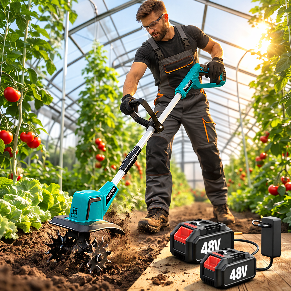 Zbog odsustva izduvnih gasova i niske razine buke, ova aku freza je savršen izbor za rad u plastenicima i staklenicima. Kompaktne dimenzije omogućavaju vam da lako obrađujete zemlju oko sadnica ili u cvjetnjacima gdje je preciznost ključna.