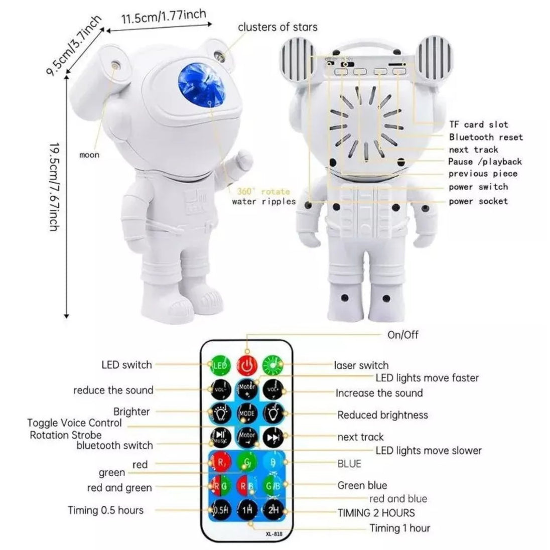 Uz unaprijeđeni dizajn, ovaj astronaut projektor dolazi s ugrađenim Bluetooth zvučnikom. Povežite ga sa svojim telefonom i uživajte u omiljenoj glazbi dok istražujete zvijezde i galaksije koje projicira.