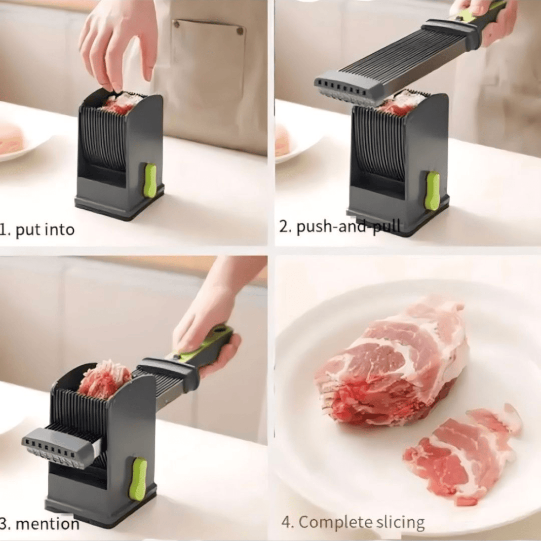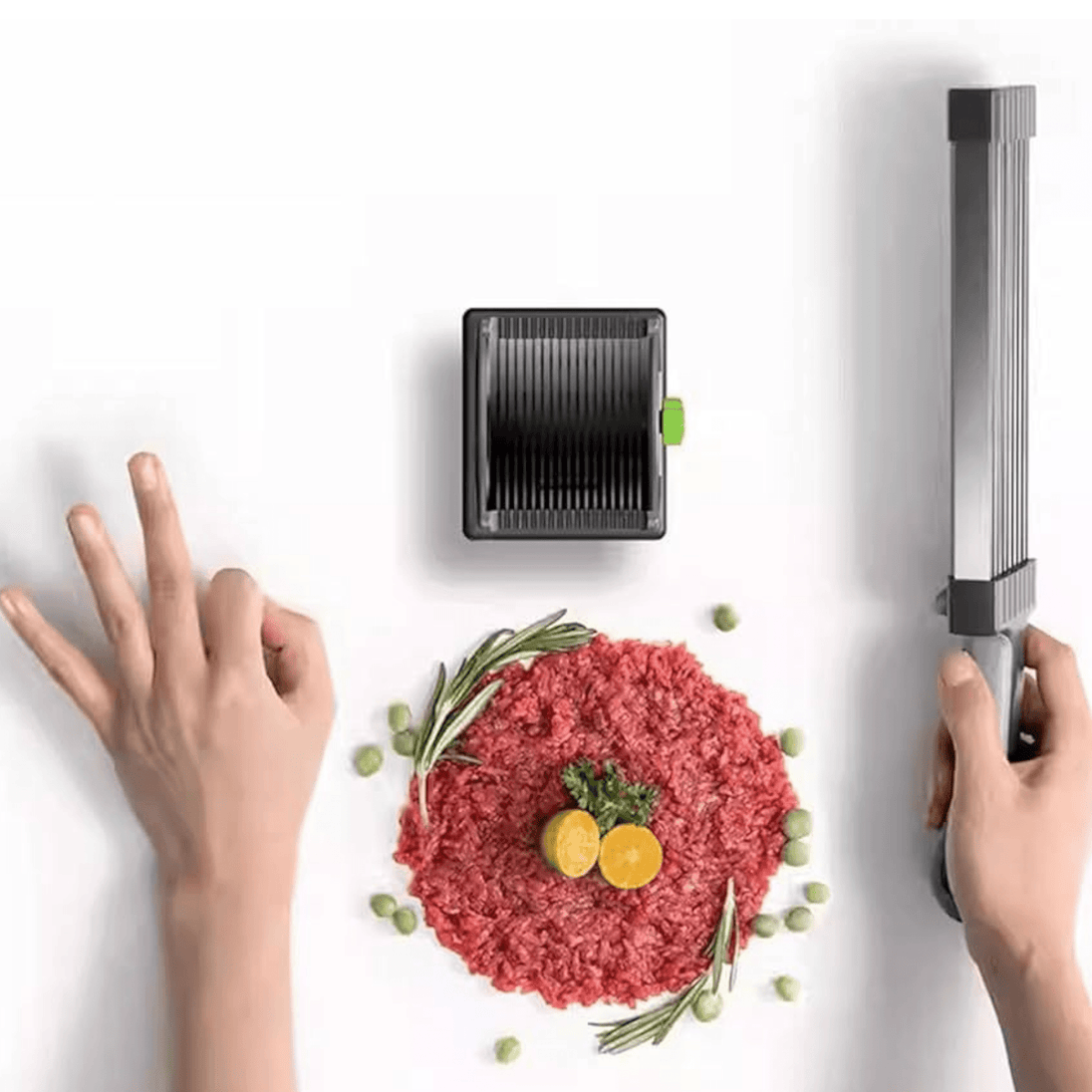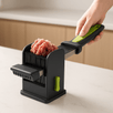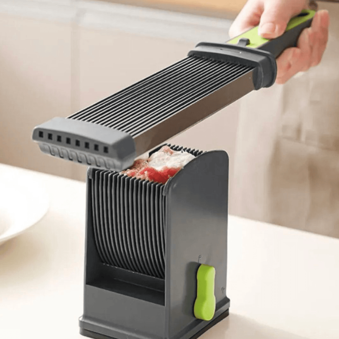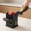- Pametan dizajn za lakše rezanje: Posebno dizajnirana posuda i položaj oštrica omogućavaju lako postavljanje i savršeno usklađeno rezanje cijelog komada mesa.