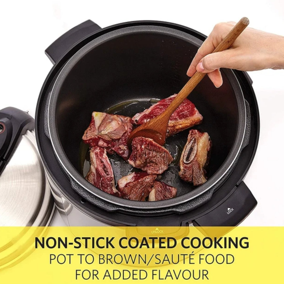 Sigurnosne značajke: Opremljen je ventilima za otpuštanje pritiska, sigurnosnim bravama i senzorima koji sprečavaju otvaranje poklopca tijekom kuhanja pod pritiskom.