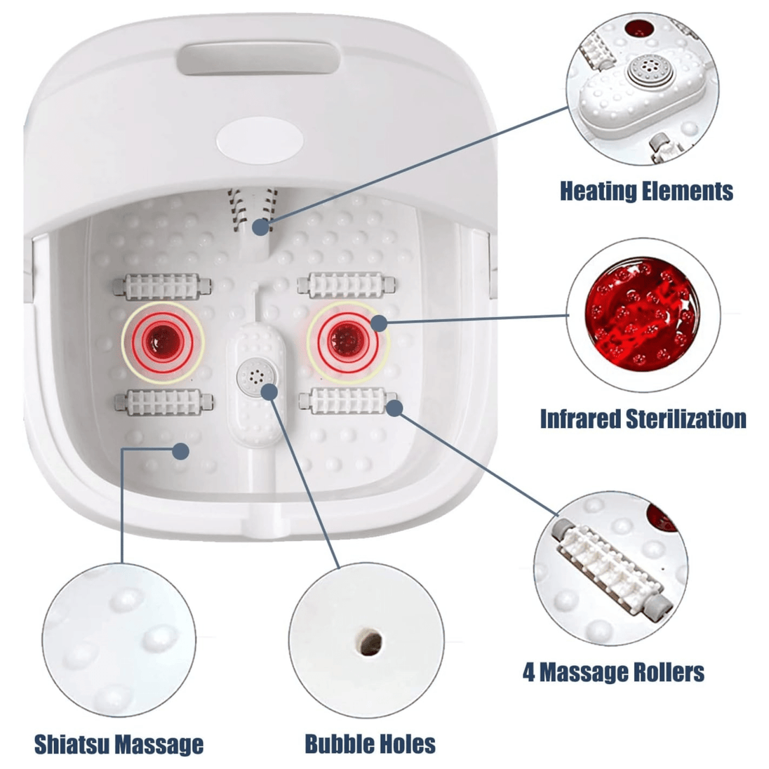 - Jacuzzi Efekt: Masažni mjehurići stimuliraju akupresurne točke na stopalima, pružajući duboku relaksaciju i uklanjanje umora. Savršeno za detoksikaciju i čišćenje stopala.