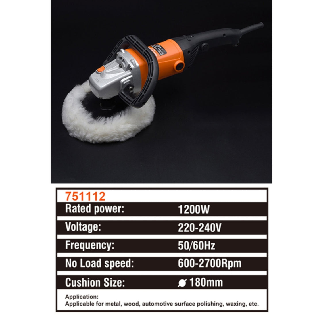 Model 751112 dolazi s snagom od 1200W i brzinom bez opterećenja od 3000 o/min, pružajući snažne performanse i brze rezultate. Opremljen sa širokim polirnim jastučićem promjera 180mm i navojem vretena M14, ova mašina omogućuje učinkovito poliranje različitih površina.