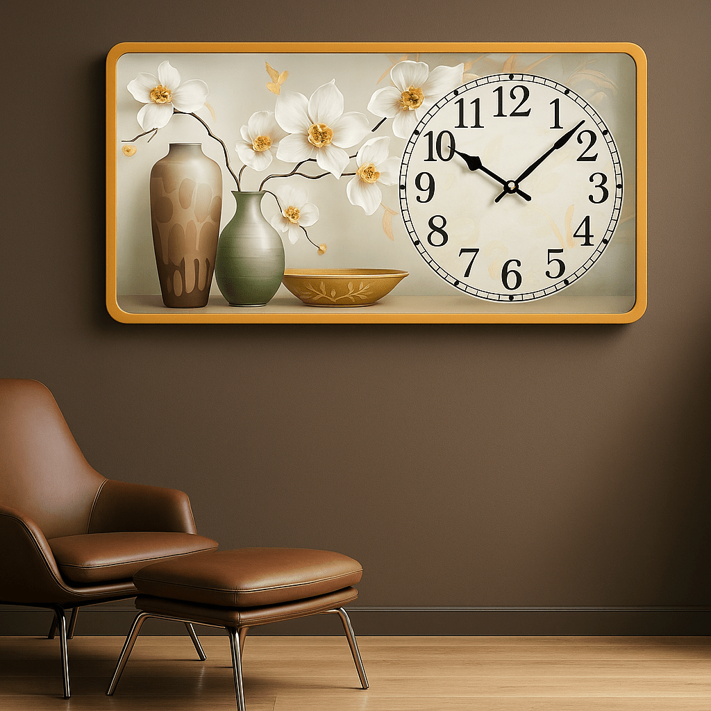 ● Elegantan Dizajn: Sat je izrađen s pažljivim detaljima, prikazujući prekrasnu vazu i cvijeće i s zlatnim okvirom, pružajući vašem prostoru sofisticiran i elegantan dodir.